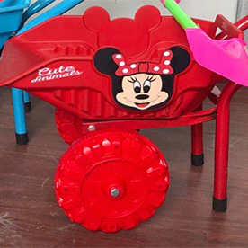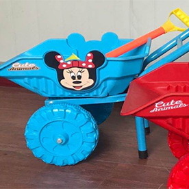 Simulation of children's beach trolley bulldozing and snow pushing two-wheeled sand play trolley.